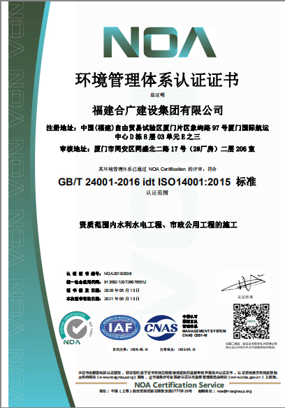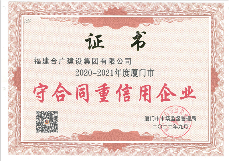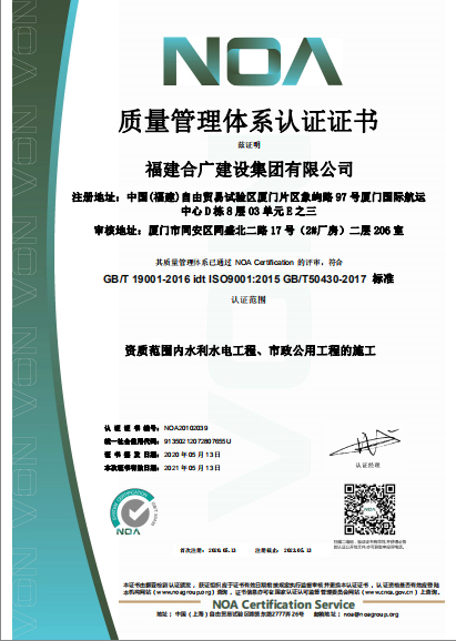 福建合廣建設(shè)集團(tuán)有限公司,注冊資本5188萬元人民幣,公司位于廈門市同安區(qū)鳳山一里151-17號(hào)。本公司成立于2013年,公司具備市政公用工程、水利水電工程、房屋建筑工程、公路工程、園林綠化等多專業(yè)施工資質(zhì)。企業(yè)從業(yè)人員100多人,各類專業(yè)技術(shù)人員70多人,其中高級職稱8人,中級職稱40多人,一級建造師6人,二級建造師15多人。